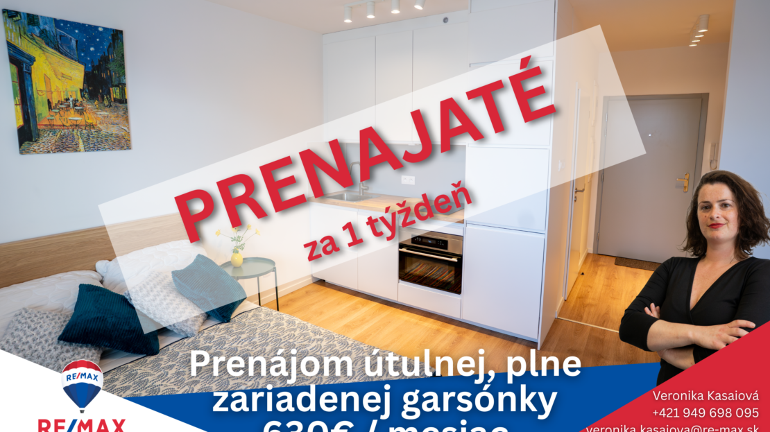 Cena: 630 €/mesiac vrátane energií, internetu a parkovacieho miesta, na začiatku sa platí + 630 € kaucia + 630 € provízia.