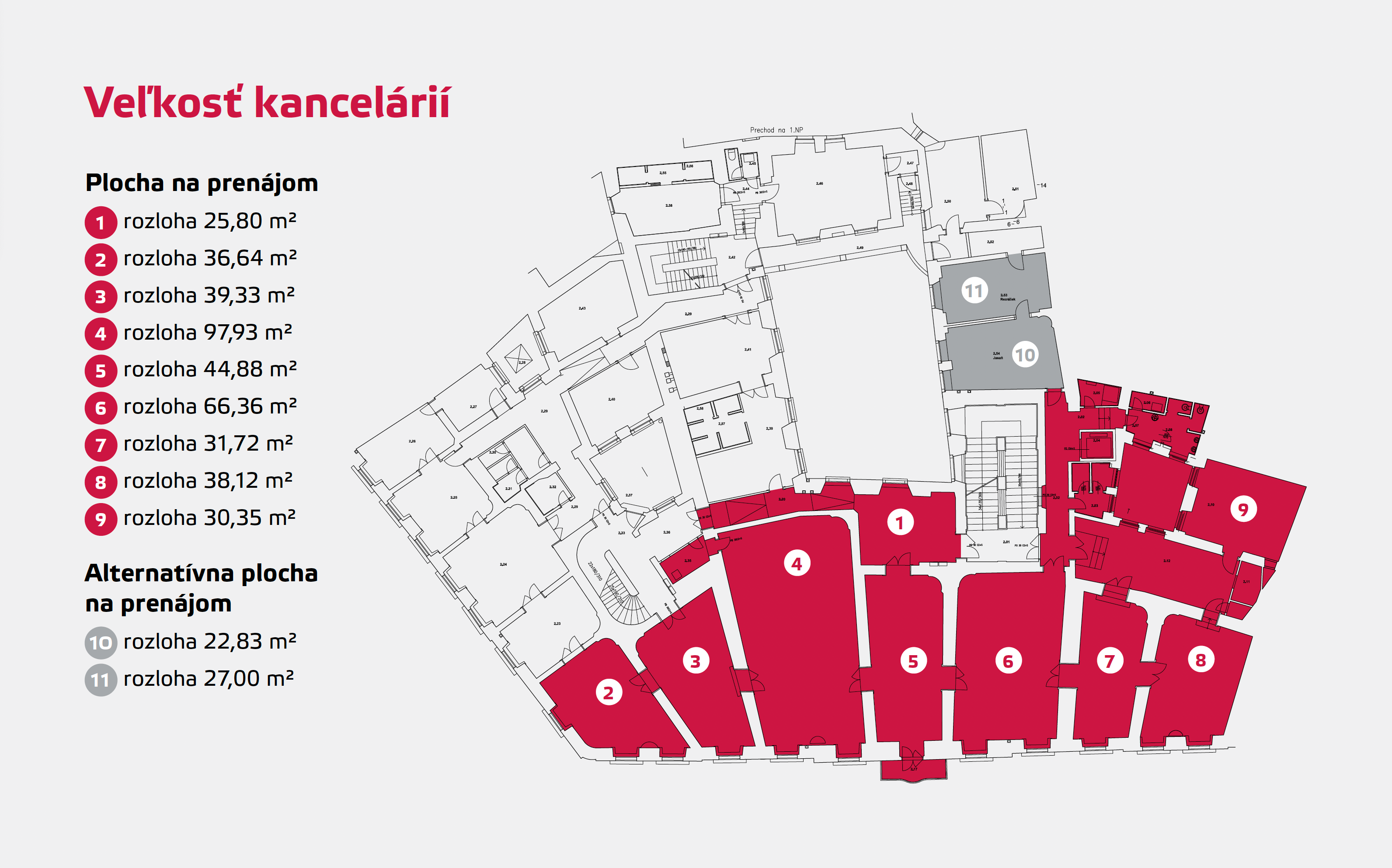 Jedná sa o holopriestor o výmere 509,5 m² na 1. poschodí historickej budovy s výťahom v Starom Meste. Priestory majú klimatizáciu, profesionálnu, vybavenú kuchyňu so spotrebičmi a toalety na poschodí (pánske/dámske).