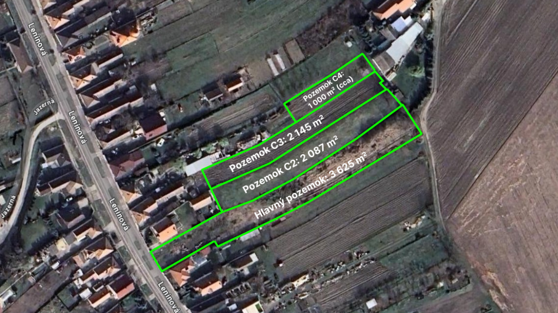 Hľadáte rozsiahly pozemok s možnosťou výstavby rodinných domov, radovej zástavby alebo iného developerského projektu? Ponúkame vám jedinečný súbor piatich pozemkov s celkovou výmerou približne 8 857 m², ktorý otvára široké spektrum možností pre vašu investíciu.